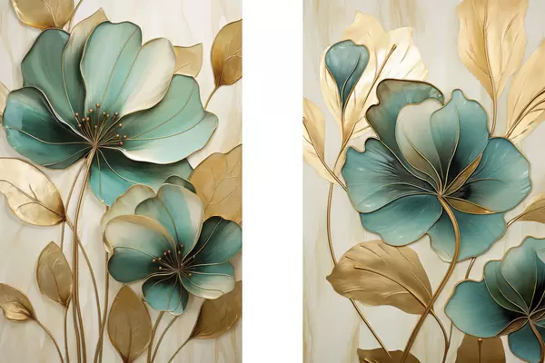 Poster Große blaugrüne und gelbe Blumen mit Konturen, umgeben von gelben Blättern vor abstraktem Hintergrund Nr d01235