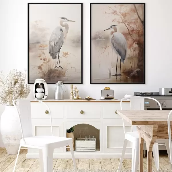 Poster Ein Reiher steht auf einem Felsen in einem See, im Hintergrund hohe Gräser und Bäume. Nr d01239