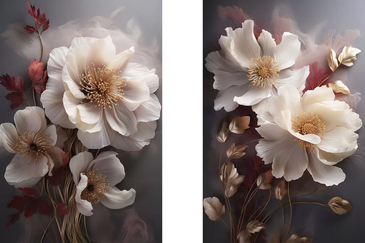 Poster Zarte Pfingstrosen mit dünnen, zarten Blütenblättern, umgeben von dunkelroten und gelben Blättern vor einem abstrakten Hintergrund Nr d01243