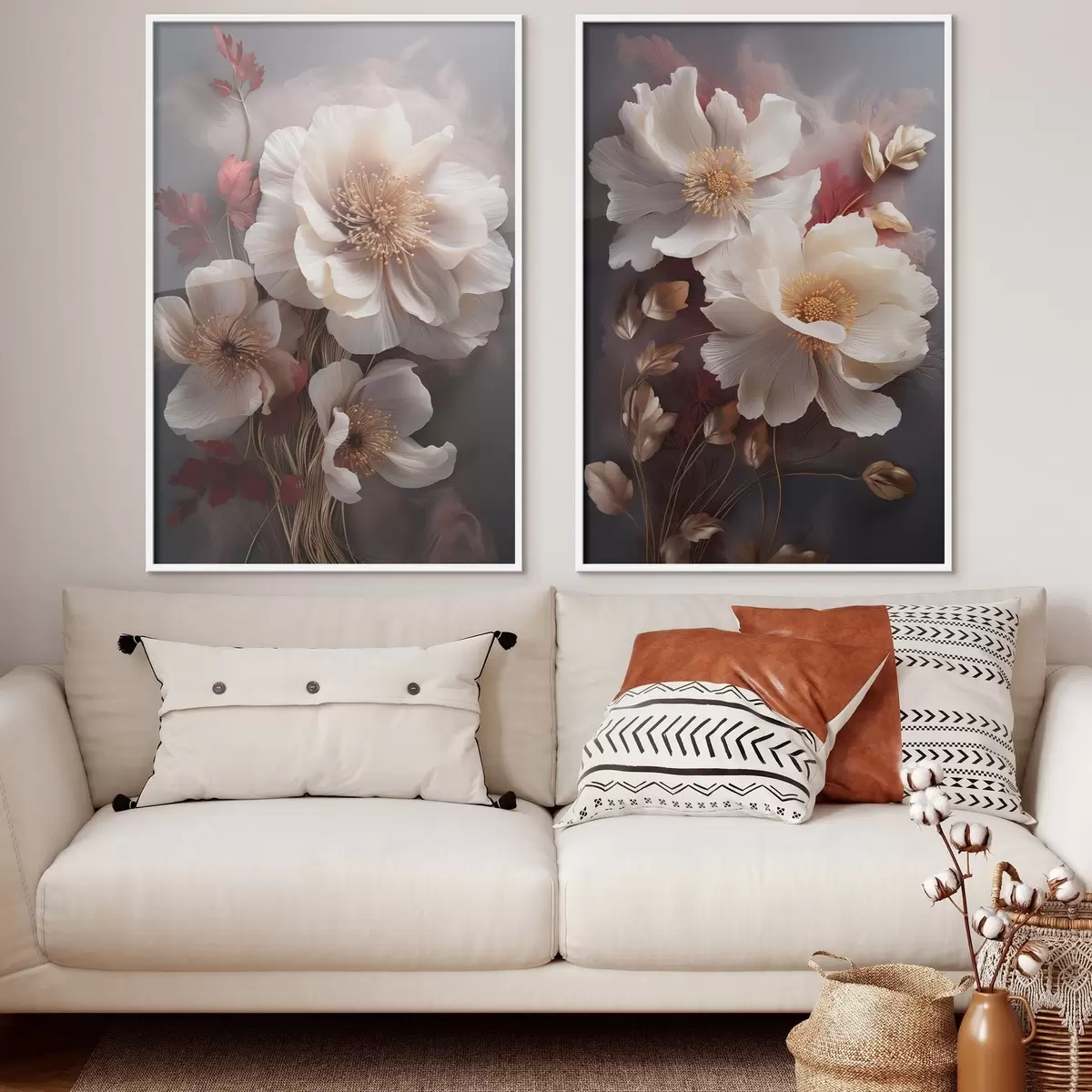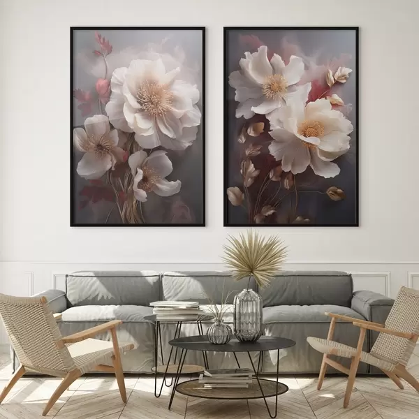 Poster Zarte Pfingstrosen mit dünnen, zarten Blütenblättern, umgeben von dunkelroten und gelben Blättern vor einem abstrakten Hintergrund d01243