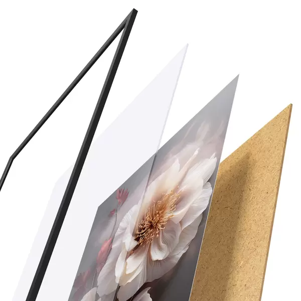 Das Poster besteht aus einem Rahmen, Plexiglas, einem gedruckten Bild und einer Rückwand aus Spanplatten. Dank der Halterungen auf der Rückseite kann das Poster sofort an die Wand gehängt werden.