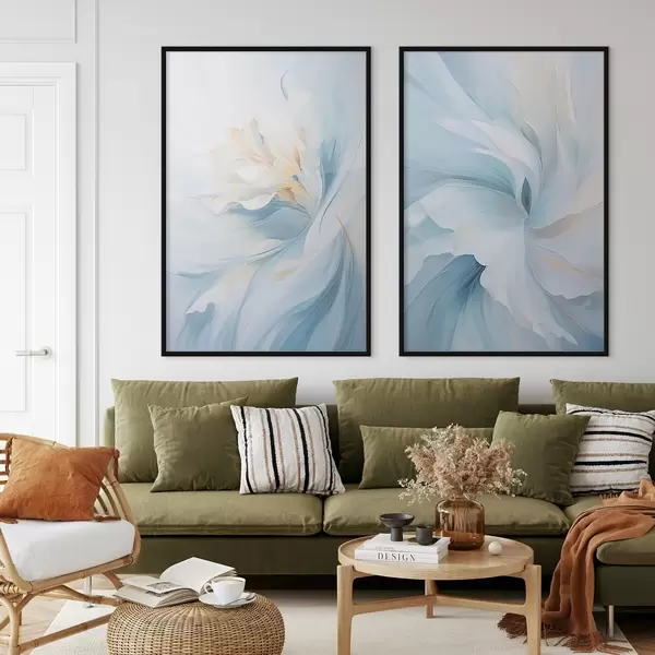 Poster Abstrakte, zarte, durchscheinende Blütenblätter, die sich bei sanfter Beleuchtung und einer malerischen Textur nach innen drehen. d01244