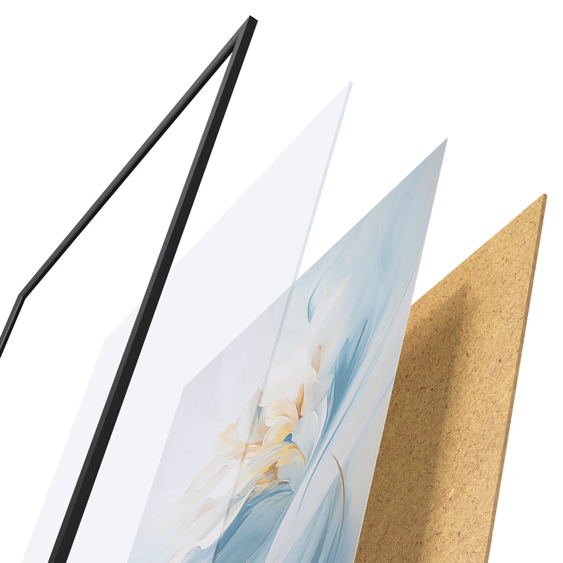 Das Poster besteht aus einem Rahmen, Plexiglas, einem gedruckten Bild und einer Rückwand aus Spanplatten. Dank der Halterungen auf der Rückseite kann das Poster sofort an die Wand gehängt werden.