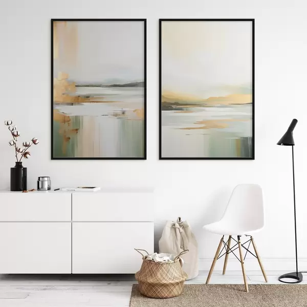 Poster Abstrakte Landschaft mit Gelb- und Grüntönen, Wasser, das den Himmel und entfernte Berge reflektiert, blasser, dunstiger Himmel d01245