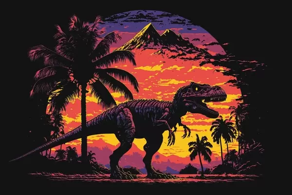 Poster Dinosaurier bei Sonnenuntergang in den Palmen Nr f33894
