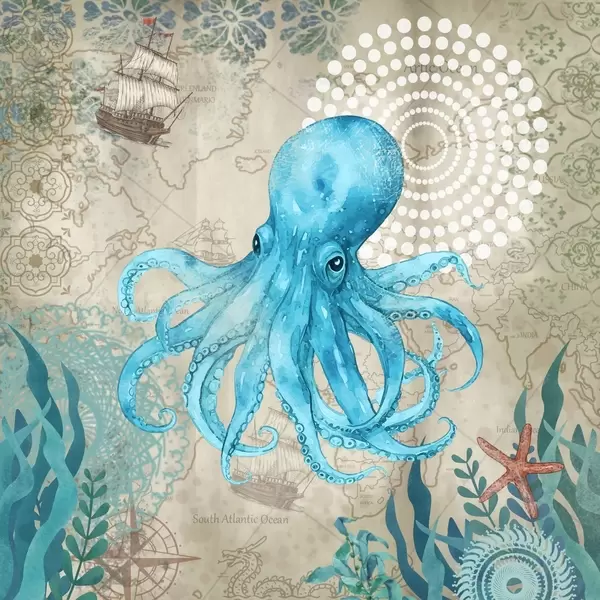 Poster Blauer Oktopus mit Meereskarte Nr f37154