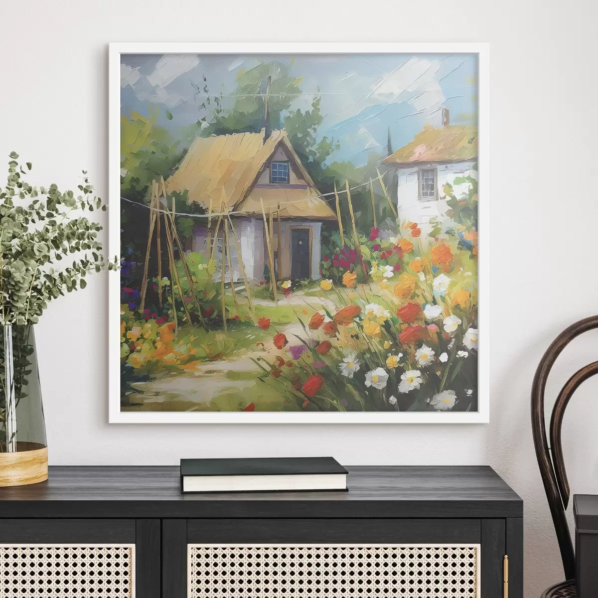 Poster Sommergarten mit Blumen, Landhaus, blauer Himmel, Ölfarbe Pinselstriche Nr f38494