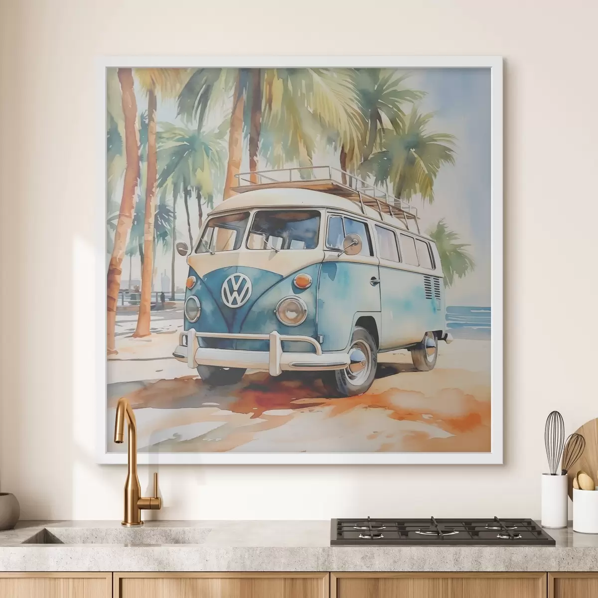 Poster Ein Reiseauto ist am Strand vor einem Hintergrund von Aquarellpalmen geparkt f38911