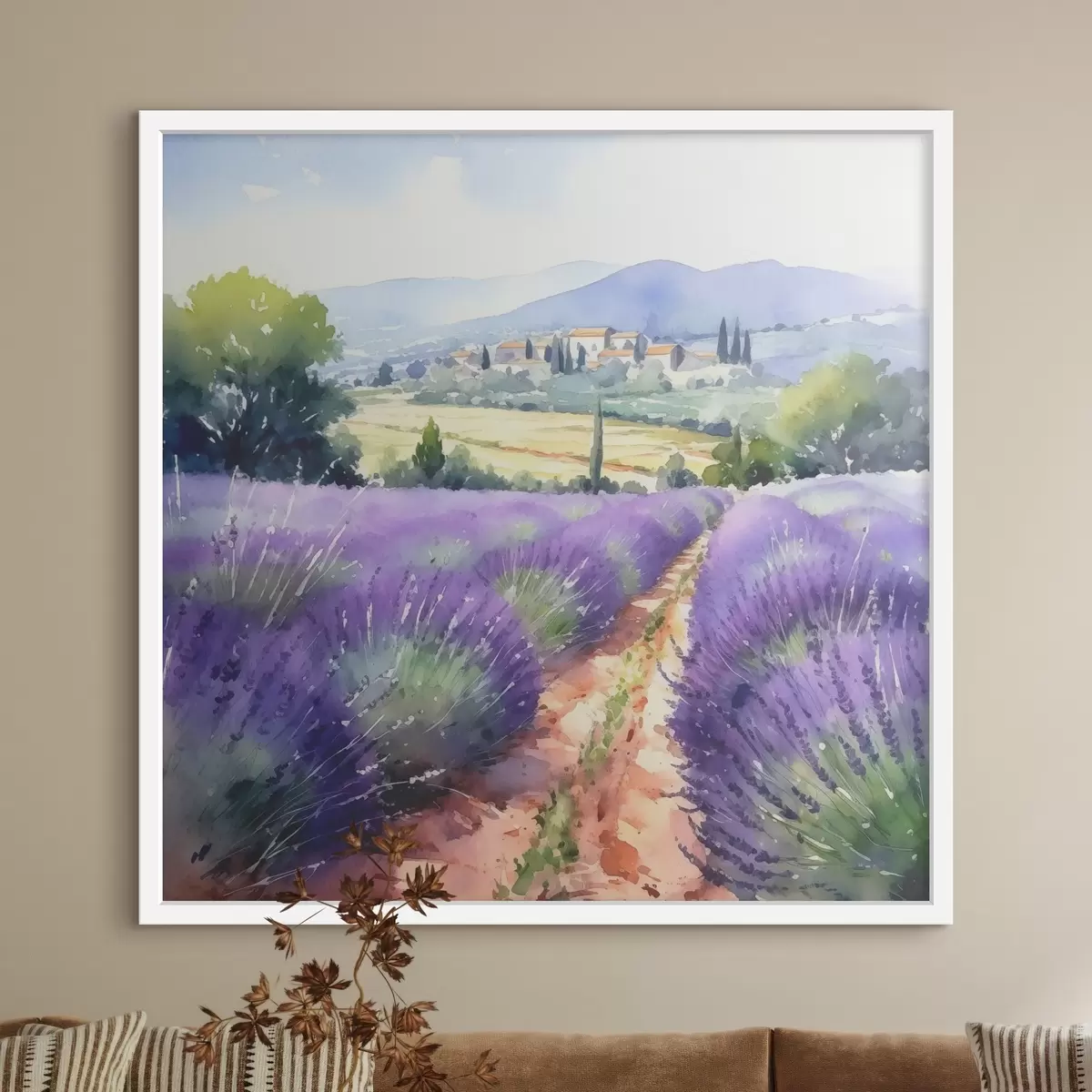 Poster Aquarell Lavendelfeld vor dem Hintergrund von Bergen und Landschaften f38913