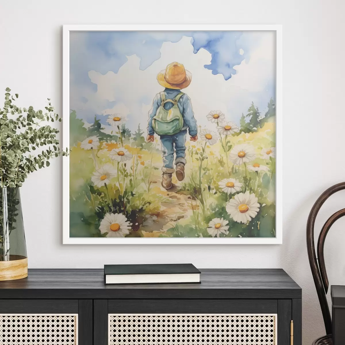 Poster Ein Junge mit Cowboyhut, grünem Rucksack auf dem Rücken und blauem Anzug geht einen Weg durch ein Kamillenfeld entlang, Aquarell Nr f38946