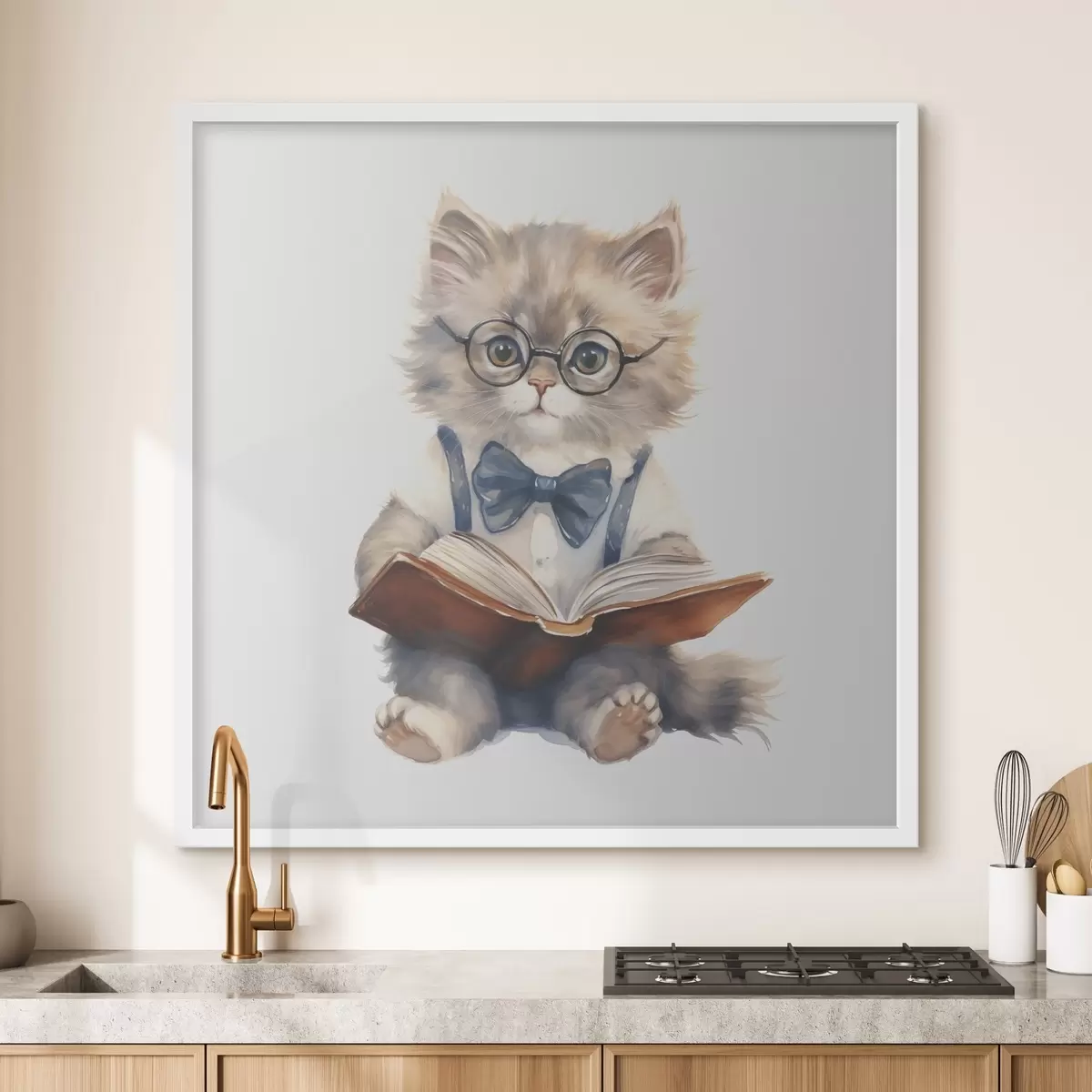 Poster Ein graues Kätzchen mit einer schwarzen Brille und einem blauen Anzug liest ein Buch Aquarell Nr f39023