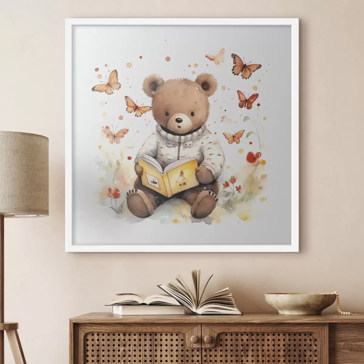 Poster Ein Braunbär im Pullover liest ein Buch, umgeben von Schmetterlingen in Aquarellfarben Nr f39025