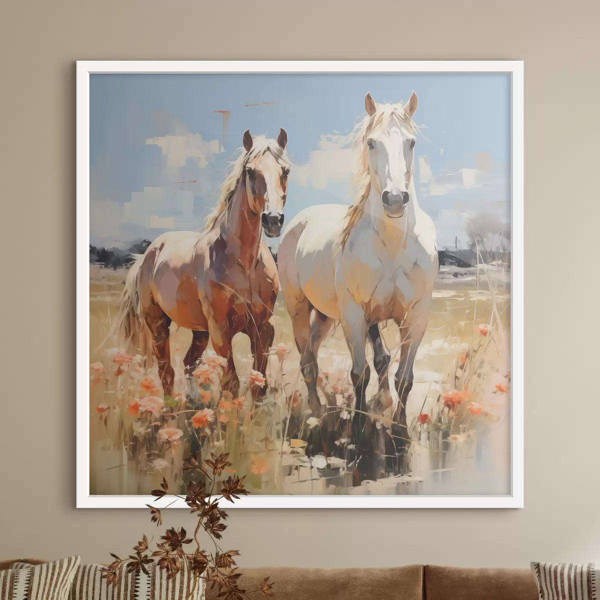 Poster Weiße und braune Pferde grasen auf einer Wiese zwischen wilden Blumen, Ölgemälde, abstrakte Kunst f39187