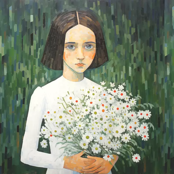 Poster Ein Mädchen in einem weißen Kleid mit einem Strauß weißer Gänseblümchen in den Händen auf grünem Hintergrund Nr f39328