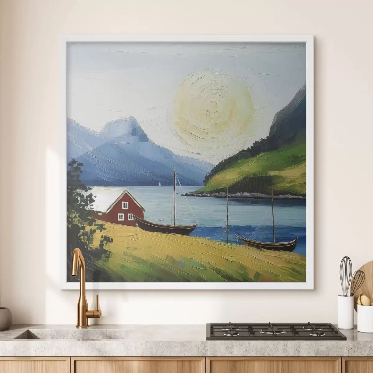 Poster Nordischer Sommer, kleines Haus an der Meeresküste, Sonne am blauen Himmel, Berge Nr f39423