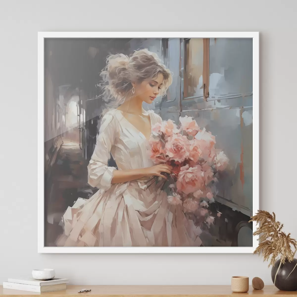 Poster Ein Mädchen in einem weißen Kleid am Bahnhof hält einen Strauß rosa Rosen in den Händen, Ölgemälde Nr f39438