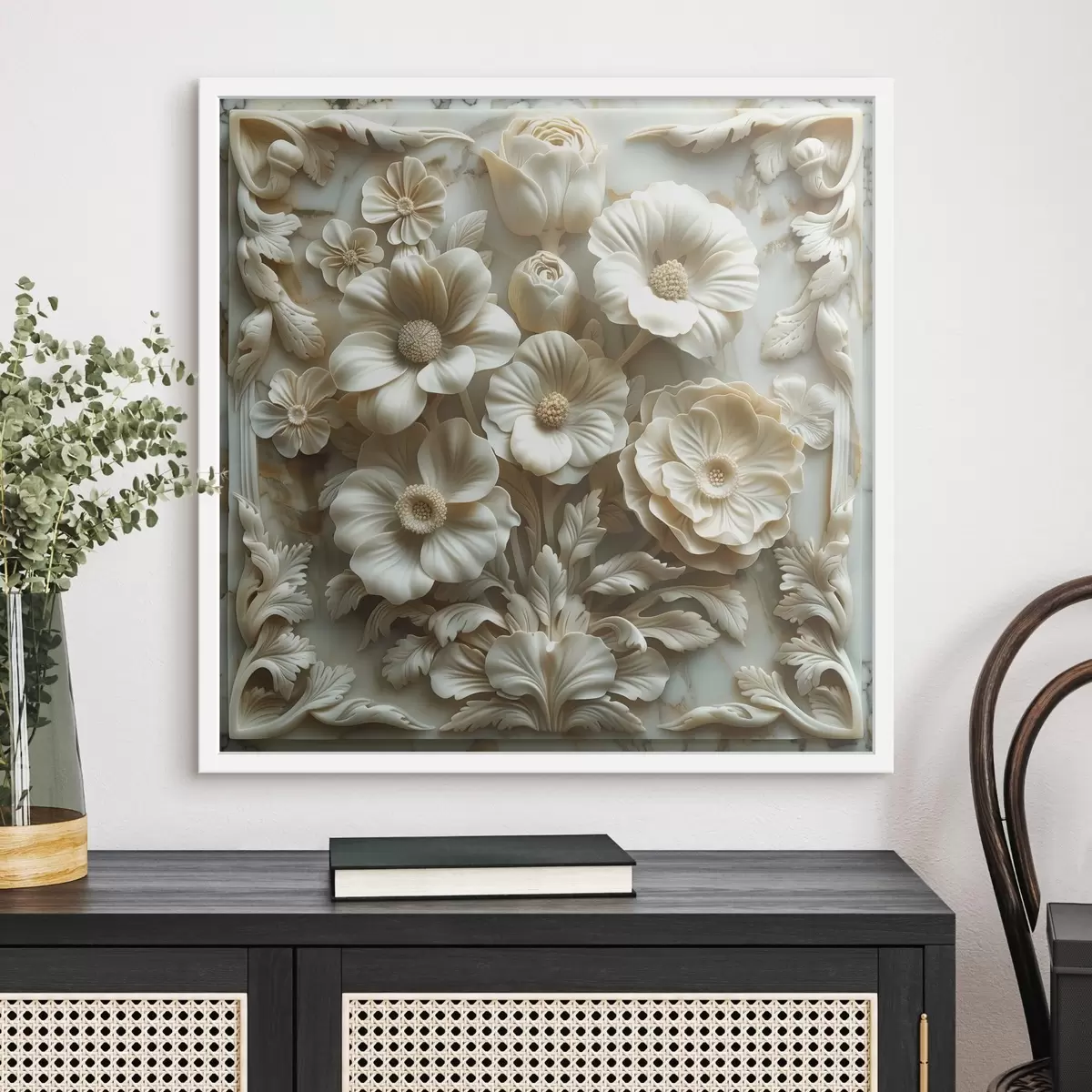 Poster weiße 3D-Basreliefblumen auf einem Marmorhintergrund mit einem Rahmen Nr f39739