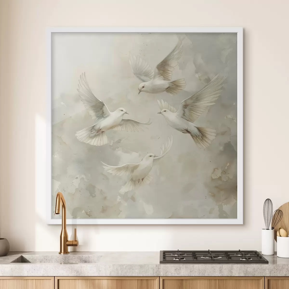 Poster Aquarell fliegende Vögel, zarte beige und weiße Farben, Tauben Nr f39976