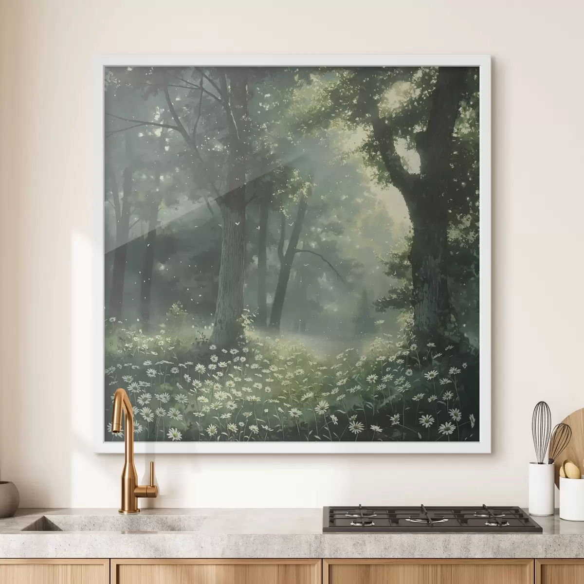 Poster Dichter Wald mit Sonnenlicht in den Bäumen, Kamille Blumen, grünes Gras, Natur Nr f40224