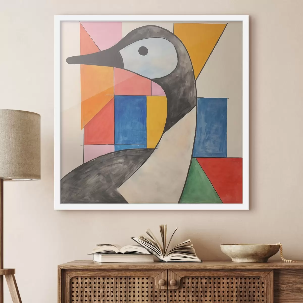 Poster Eine kubistische Zeichnung, die eine Gans vor dem Hintergrund eines Buntglasfensters darstellt Nr f40320