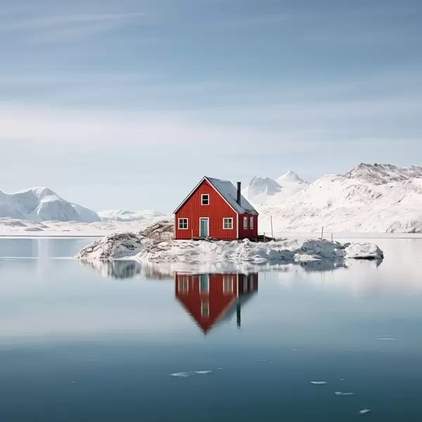Poster Minimalistische Winterlandschaft rotes Haus am See Nr f41437