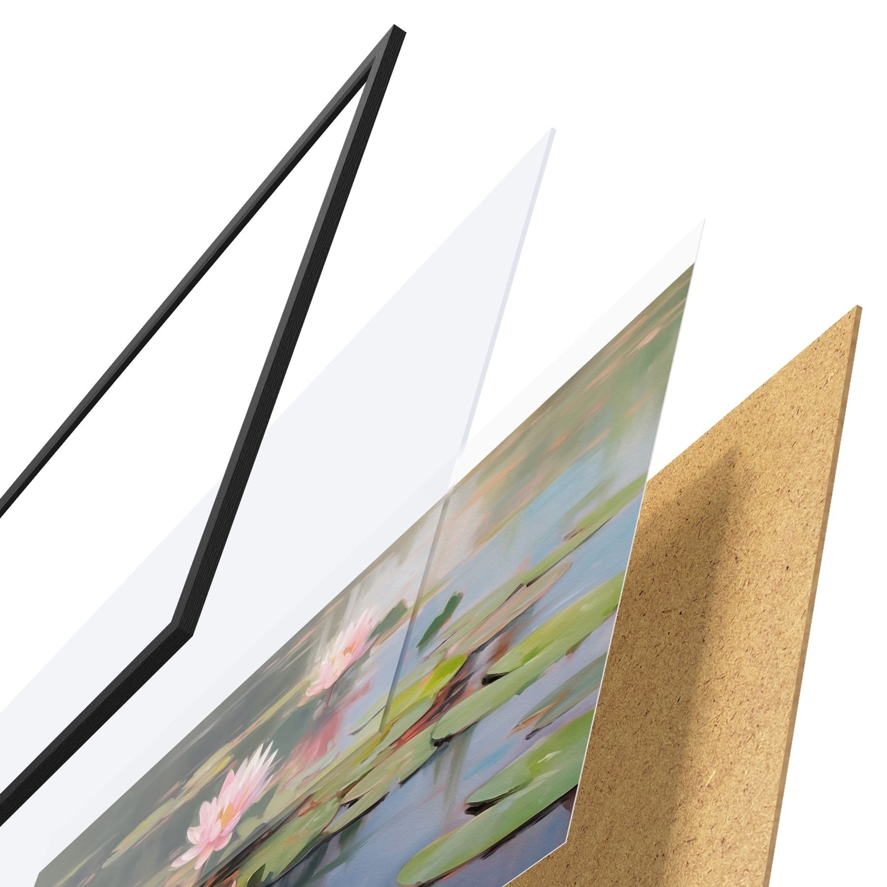 Das Poster besteht aus einem Rahmen, Plexiglas, einem gedruckten Bild und einer Rückwand aus Spanplatten. Dank der Halterungen auf der Rückseite kann das Poster sofort an die Wand gehängt werden.
