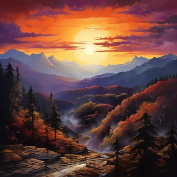 Poster Wald und Berge bei Sonnenuntergang f44045