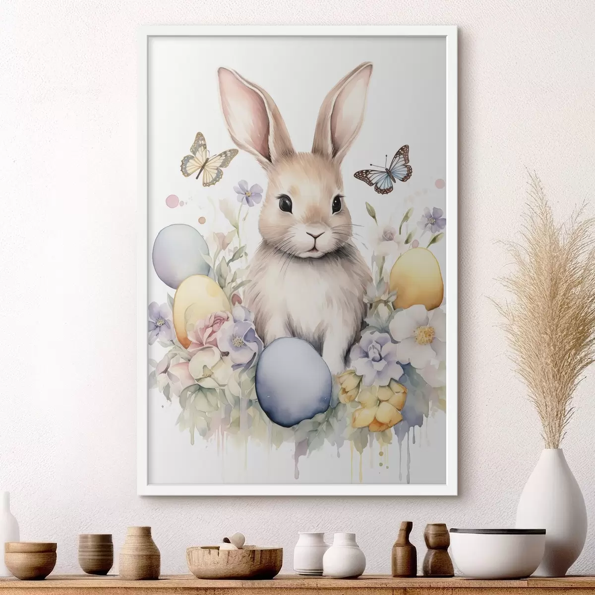 Poster Niedliches Häschen im Aquarellstil in Blumen mit Schmetterlingen Nr f44388