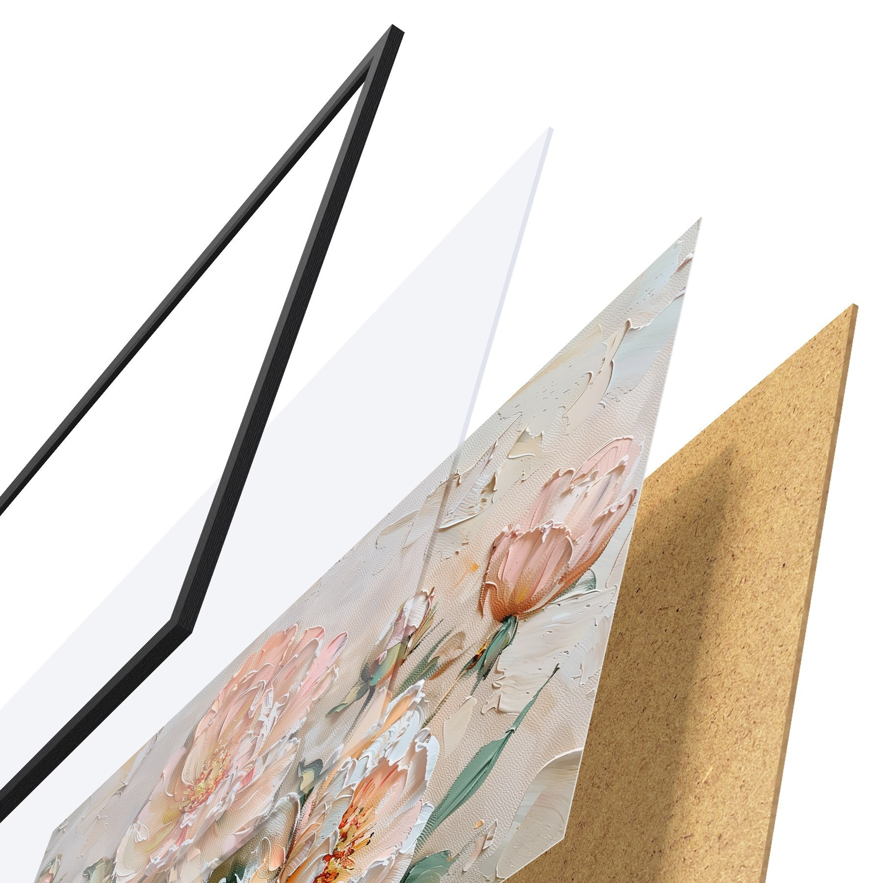 Das Poster besteht aus einem Rahmen, Plexiglas, einem gedruckten Bild und einer Rückwand aus Spanplatten. Dank der Halterungen auf der Rückseite kann das Poster sofort an die Wand gehängt werden.