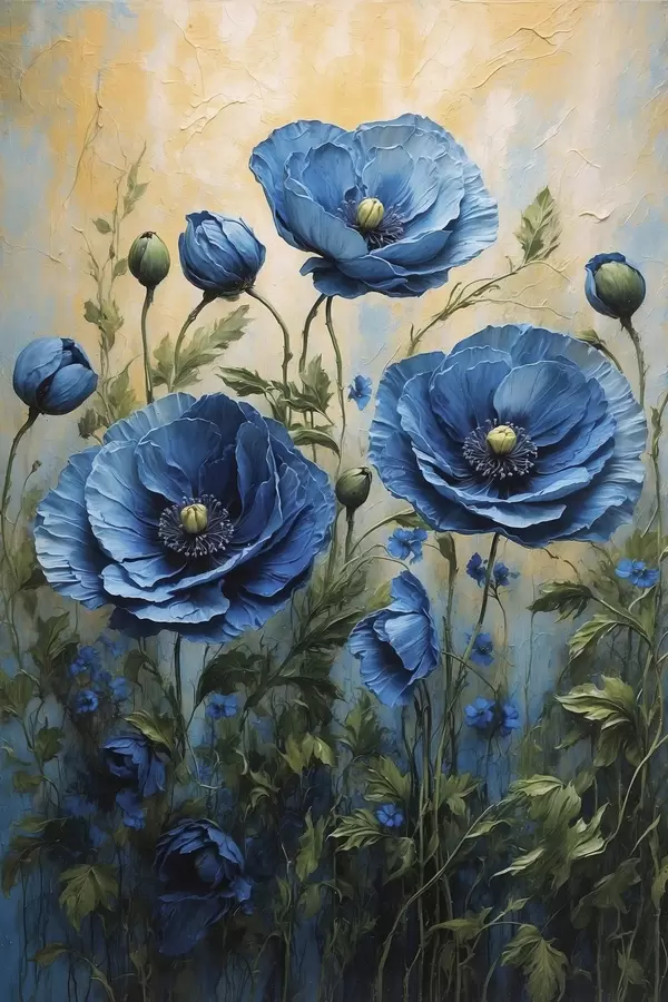 Poster Große blaue Mohnblumen mit Knospen auf hellem Hintergrund Nr f45488