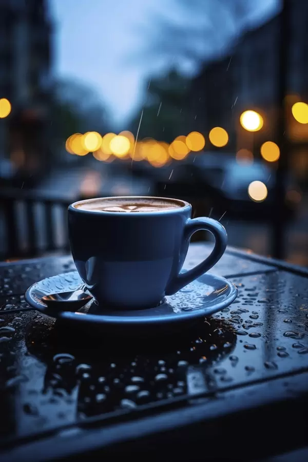 Poster Eine Tasse Kaffee auf dem Tisch im Regen Nr f45497