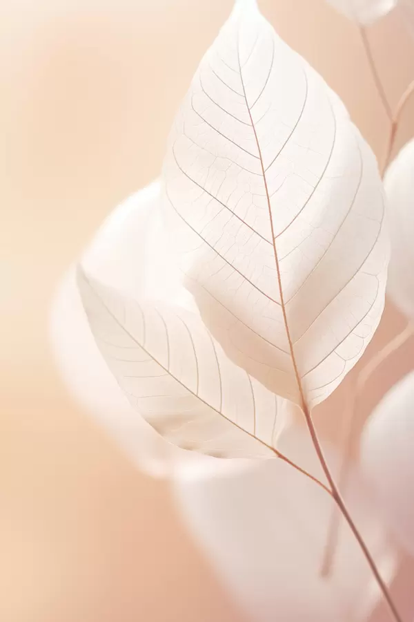Poster Zarte, durchscheinende Blätter mit verschlungenen Adermustern, sanfter pfirsichfarbener Hintergrund, minimalistische botanische Komposition f45555