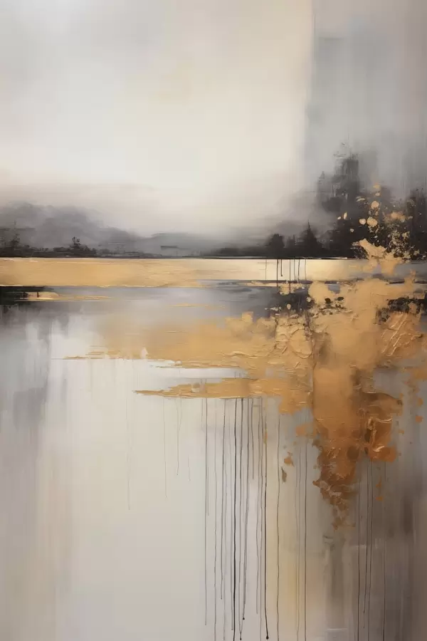 Poster Abstrakte, strukturierte Landschaft mit einem Fluss und dunklen Bäumen im Hintergrund, der Himmel ist bewölkt Nr f45576