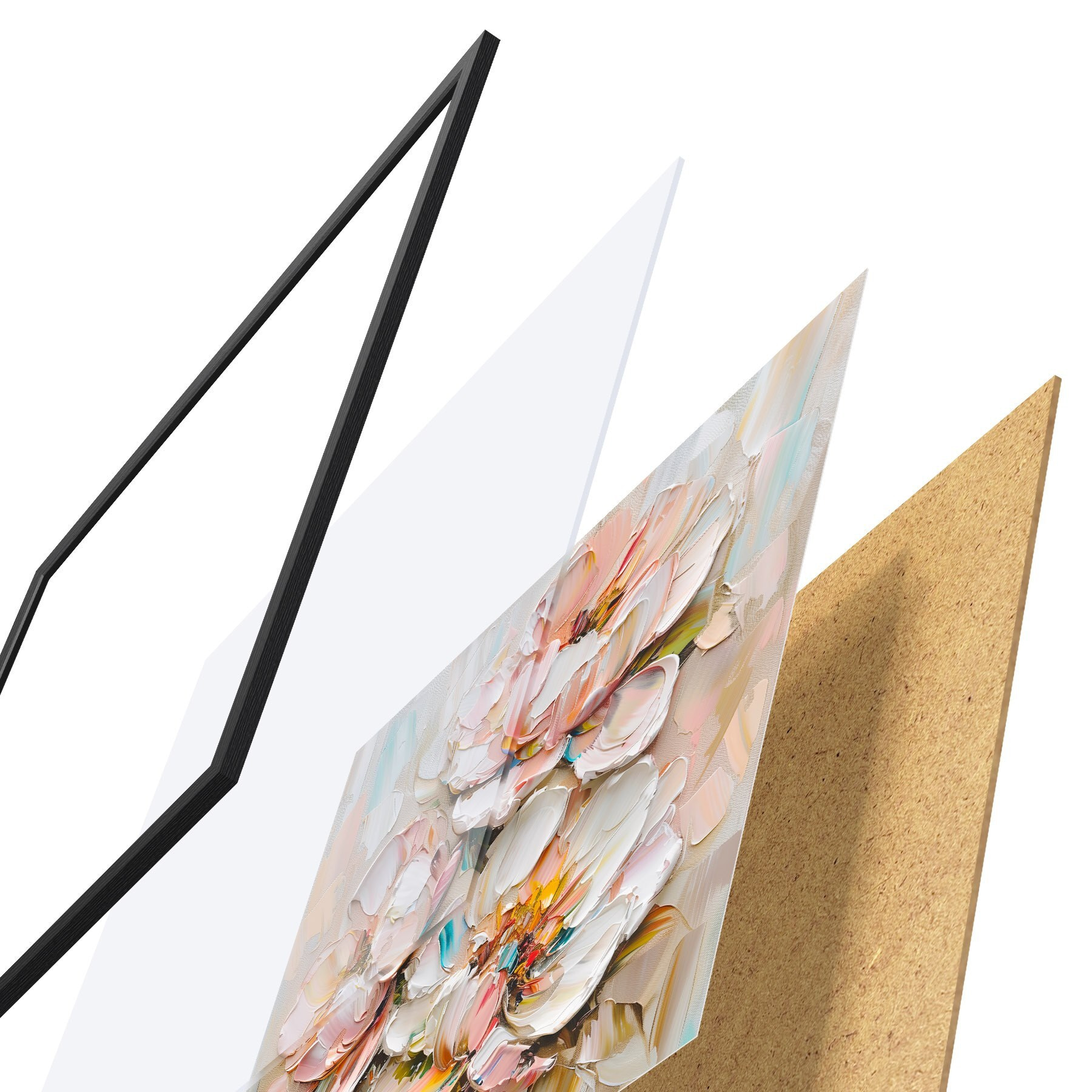 Das Poster besteht aus einem Rahmen, Plexiglas, einem gedruckten Bild und einer Rückwand aus Spanplatten. Dank der Halterungen auf der Rückseite kann das Poster sofort an die Wand gehängt werden.