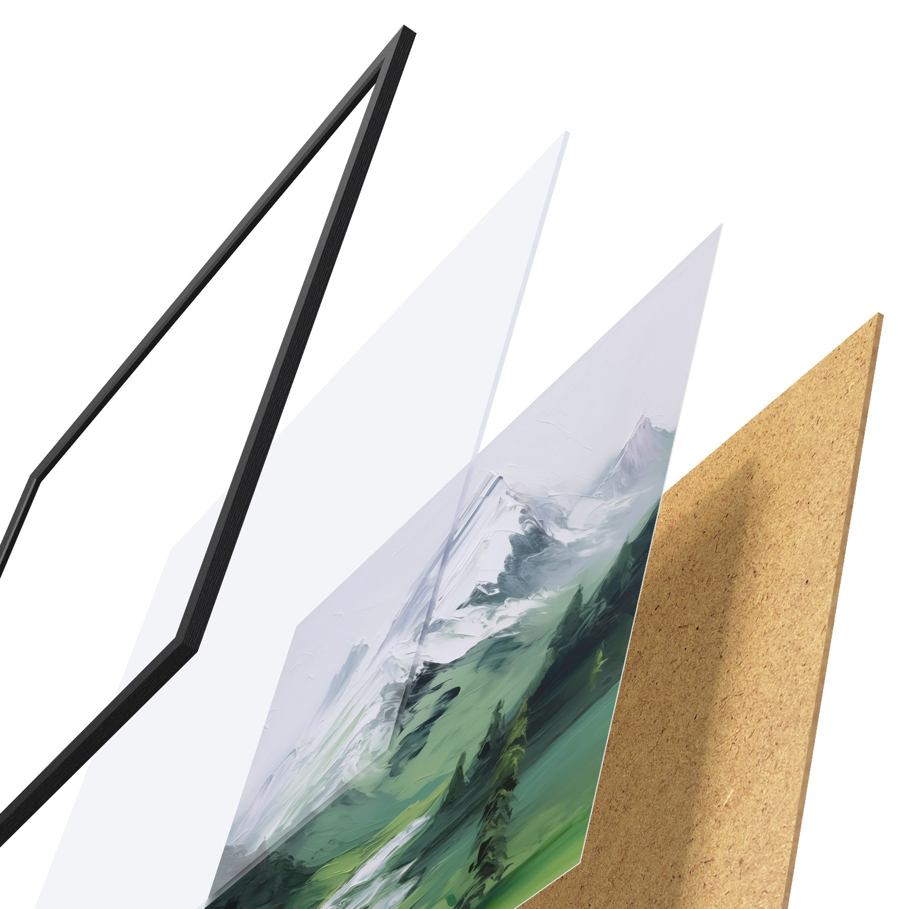 Das Poster besteht aus einem Rahmen, Plexiglas, einem gedruckten Bild und einer Rückwand aus Spanplatten. Dank der Halterungen auf der Rückseite kann das Poster sofort an die Wand gehängt werden.