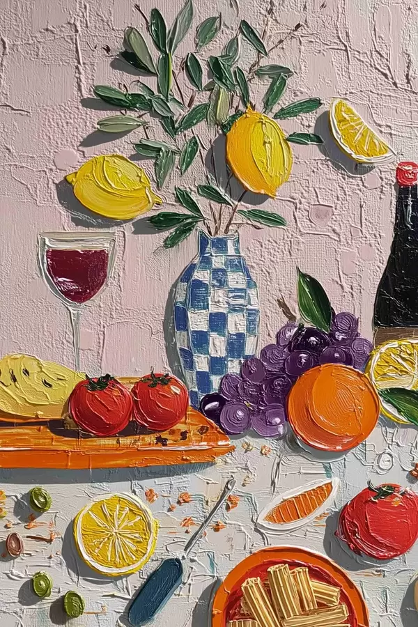 Poster Pastell-Stillleben: Zitronen, Trauben und Tomaten, Impasto f45876