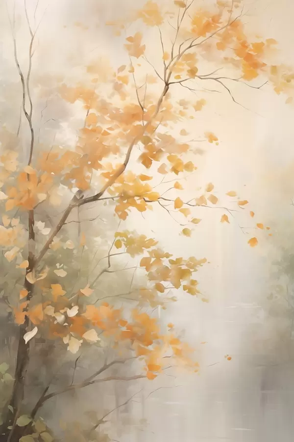 Poster Herbstliche Äste mit orangefarbenen Blättern in einem Wald mit sanftem Licht f45940