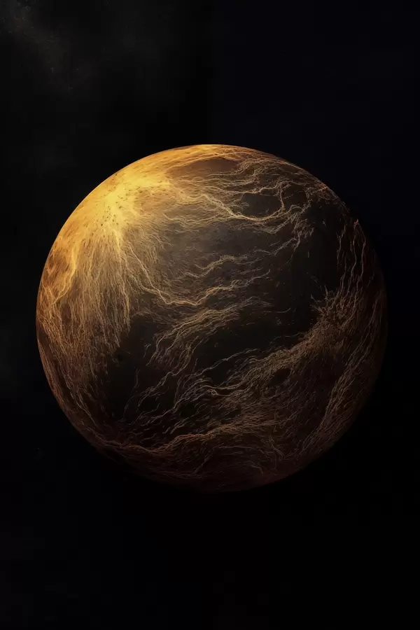 Poster Abstrakter Planet mit orangefarbenen Adern vor schwarzem Weltraumhintergrund, moderne minimalistische Kunst Nr f45943