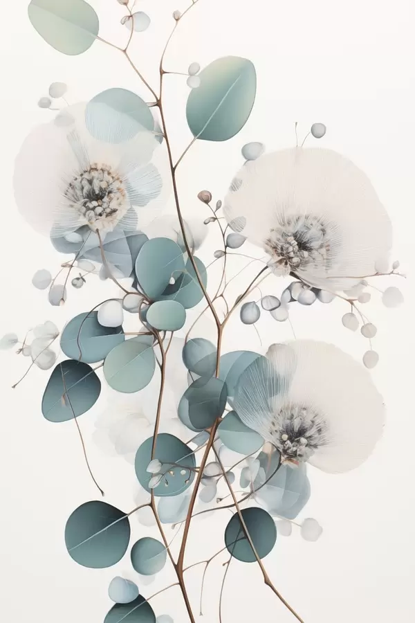 Poster Eukalyptus-Blüten mit weißen Blütenblättern, gedeckten grünen Blättern an Zweigen Nr f45946