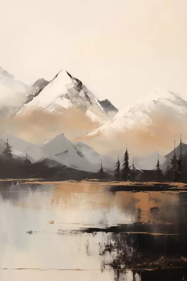 Poster Verschneite Berge mit Baumstruktur vor einem See Nr f45951