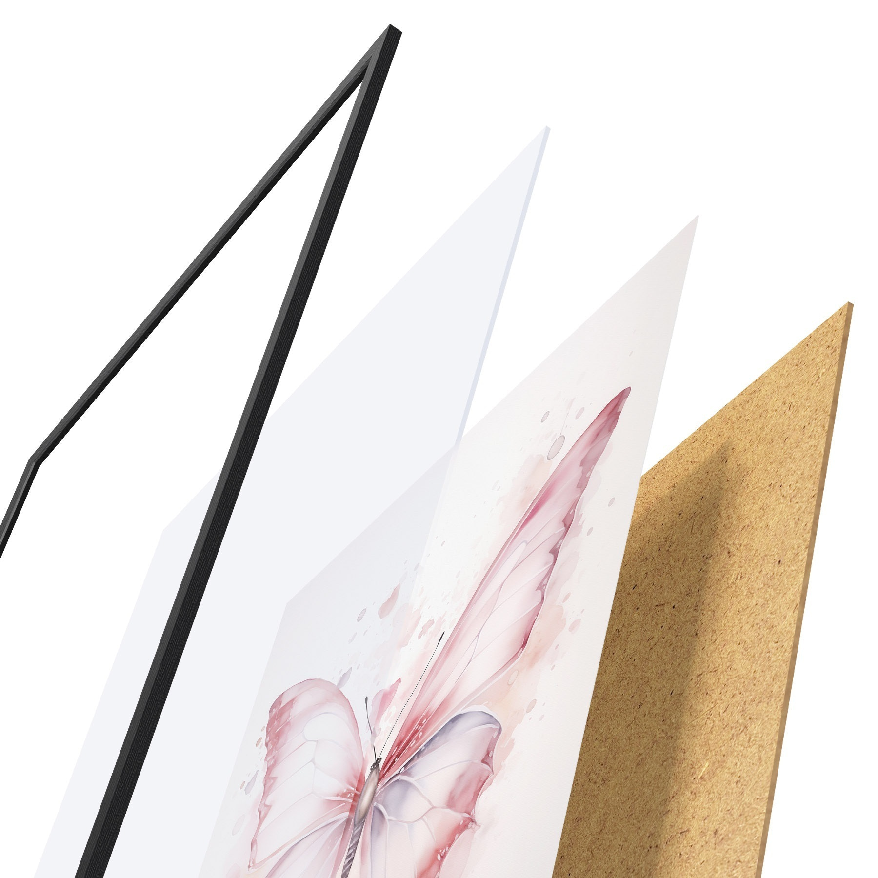 Das Poster besteht aus einem Rahmen, Plexiglas, einem gedruckten Bild und einer Rückwand aus Spanplatten. Dank der Halterungen auf der Rückseite kann das Poster sofort an die Wand gehängt werden.