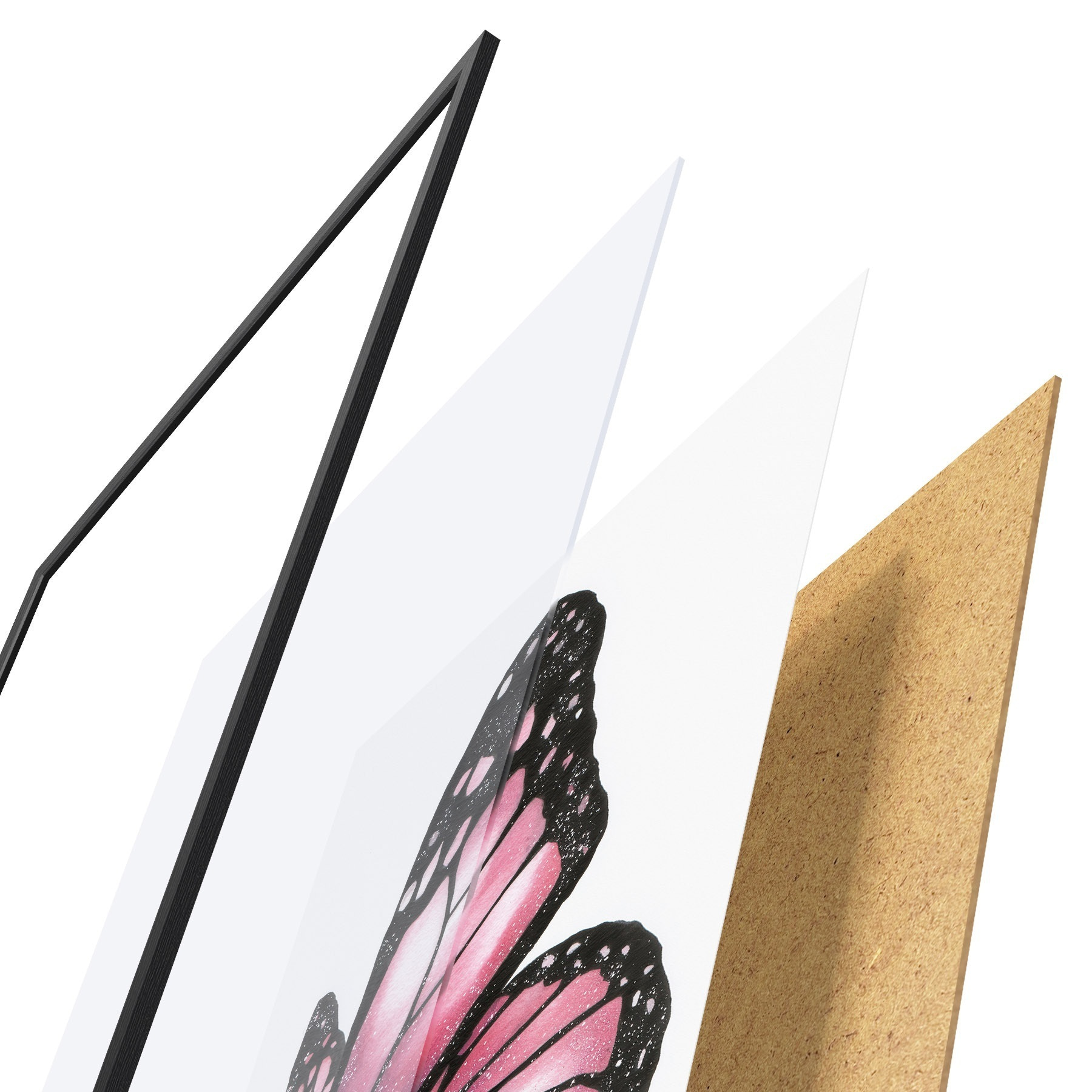 Das Poster besteht aus einem Rahmen, Plexiglas, einem gedruckten Bild und einer Rückwand aus Spanplatten. Dank der Halterungen auf der Rückseite kann das Poster sofort an die Wand gehängt werden.