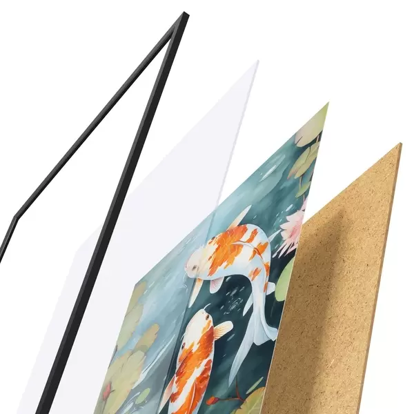 Das Poster besteht aus einem Rahmen, Plexiglas, einem gedruckten Bild und einer Rückwand aus Spanplatten. Dank der Halterungen auf der Rückseite kann das Poster sofort an die Wand gehängt werden.