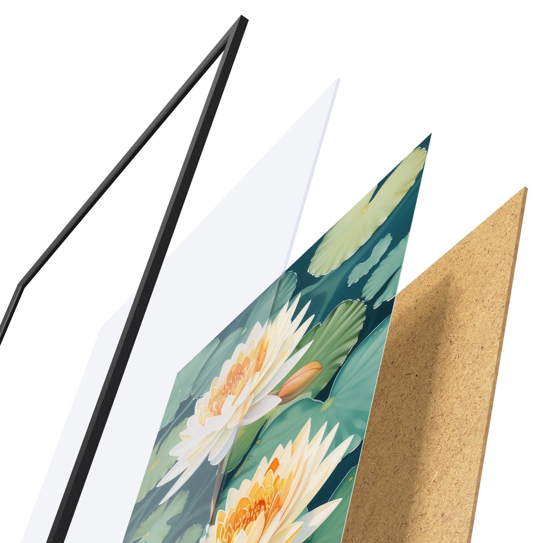 Das Poster besteht aus einem Rahmen, Plexiglas, einem gedruckten Bild und einer Rückwand aus Spanplatten. Dank der Halterungen auf der Rückseite kann das Poster sofort an die Wand gehängt werden.