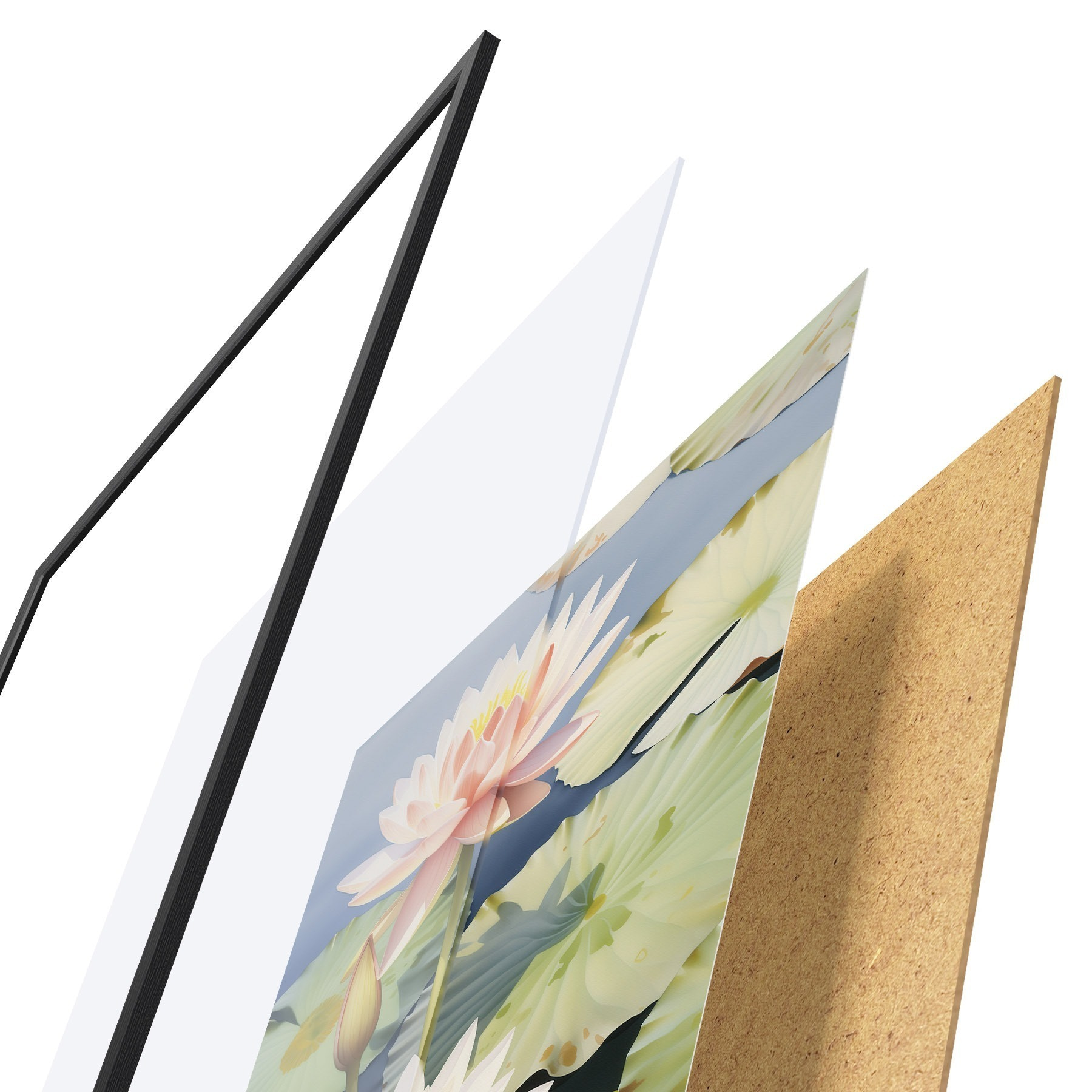Das Poster besteht aus einem Rahmen, Plexiglas, einem gedruckten Bild und einer Rückwand aus Spanplatten. Dank der Halterungen auf der Rückseite kann das Poster sofort an die Wand gehängt werden.