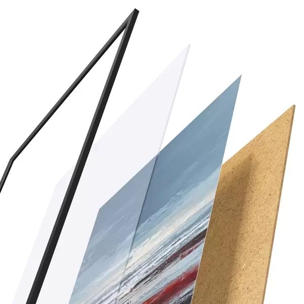 Das Poster besteht aus einem Rahmen, Plexiglas, einem gedruckten Bild und einer Rückwand aus Spanplatten. Dank der Halterungen auf der Rückseite kann das Poster sofort an die Wand gehängt werden.