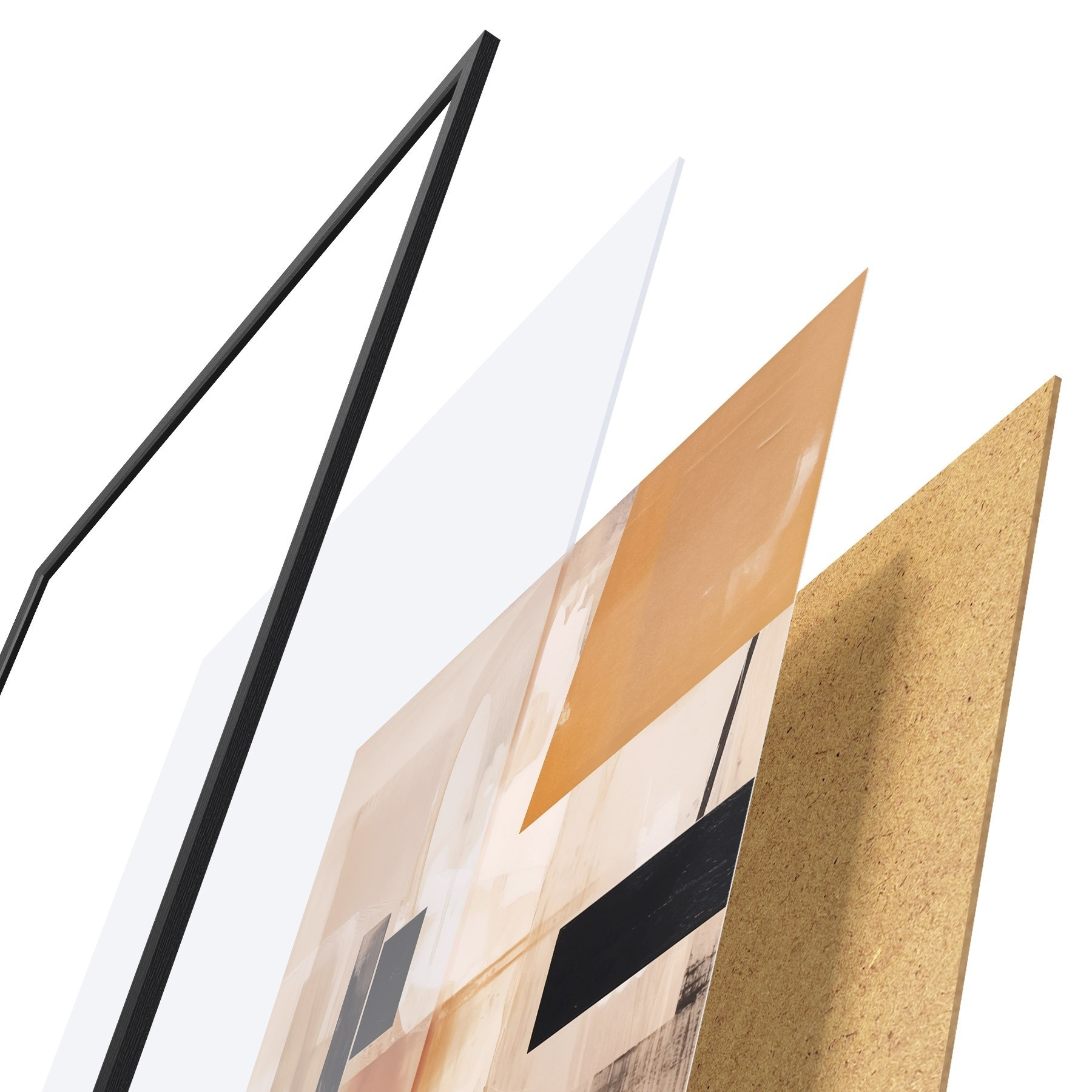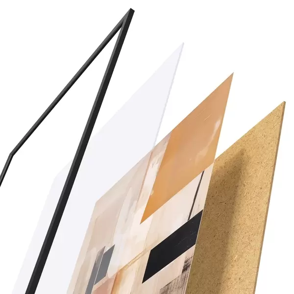 Das Poster besteht aus einem Rahmen, Plexiglas, einem gedruckten Bild und einer Rückwand aus Spanplatten. Dank der Halterungen auf der Rückseite kann das Poster sofort an die Wand gehängt werden.