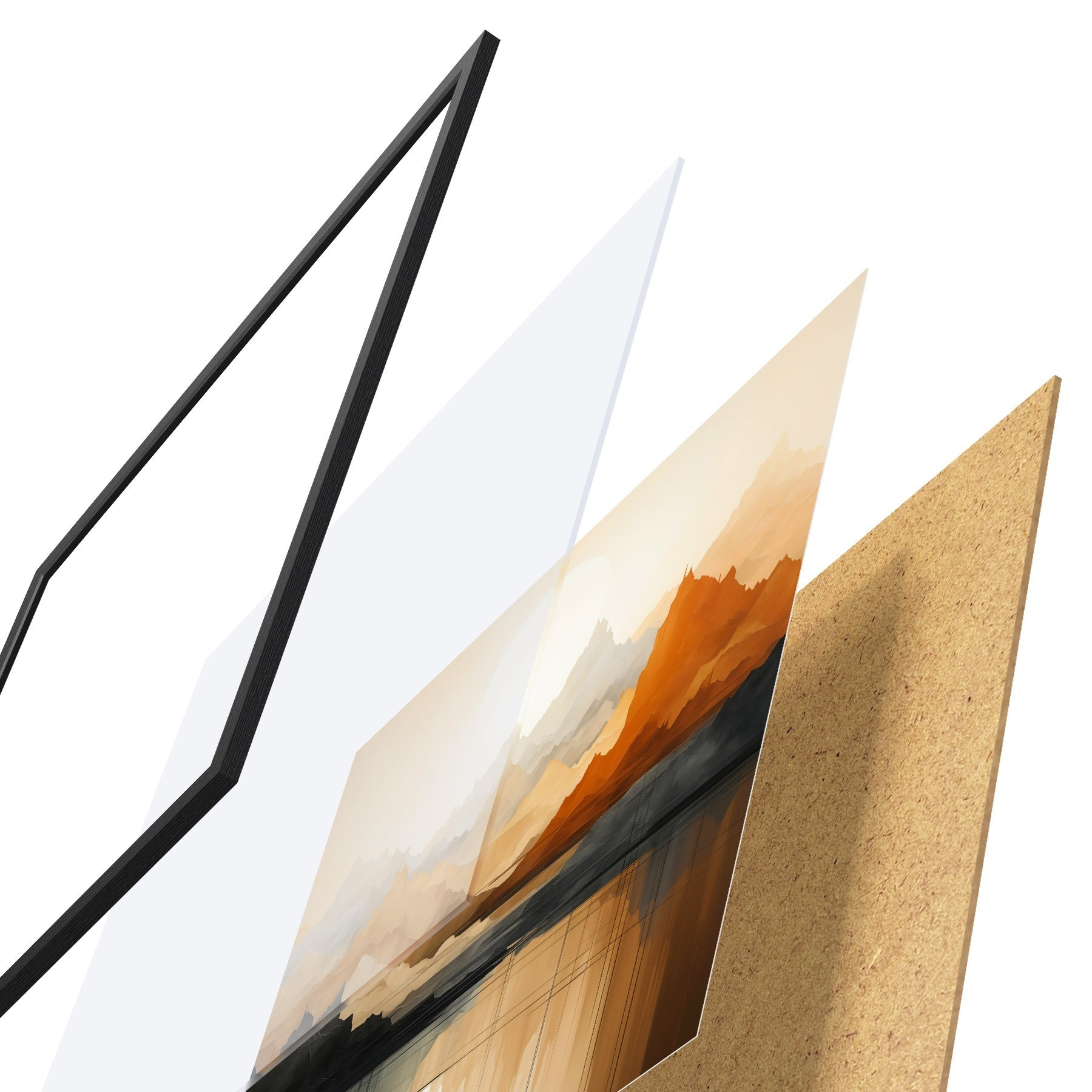 Das Poster besteht aus einem Rahmen, Plexiglas, einem gedruckten Bild und einer Rückwand aus Spanplatten. Dank der Halterungen auf der Rückseite kann das Poster sofort an die Wand gehängt werden.