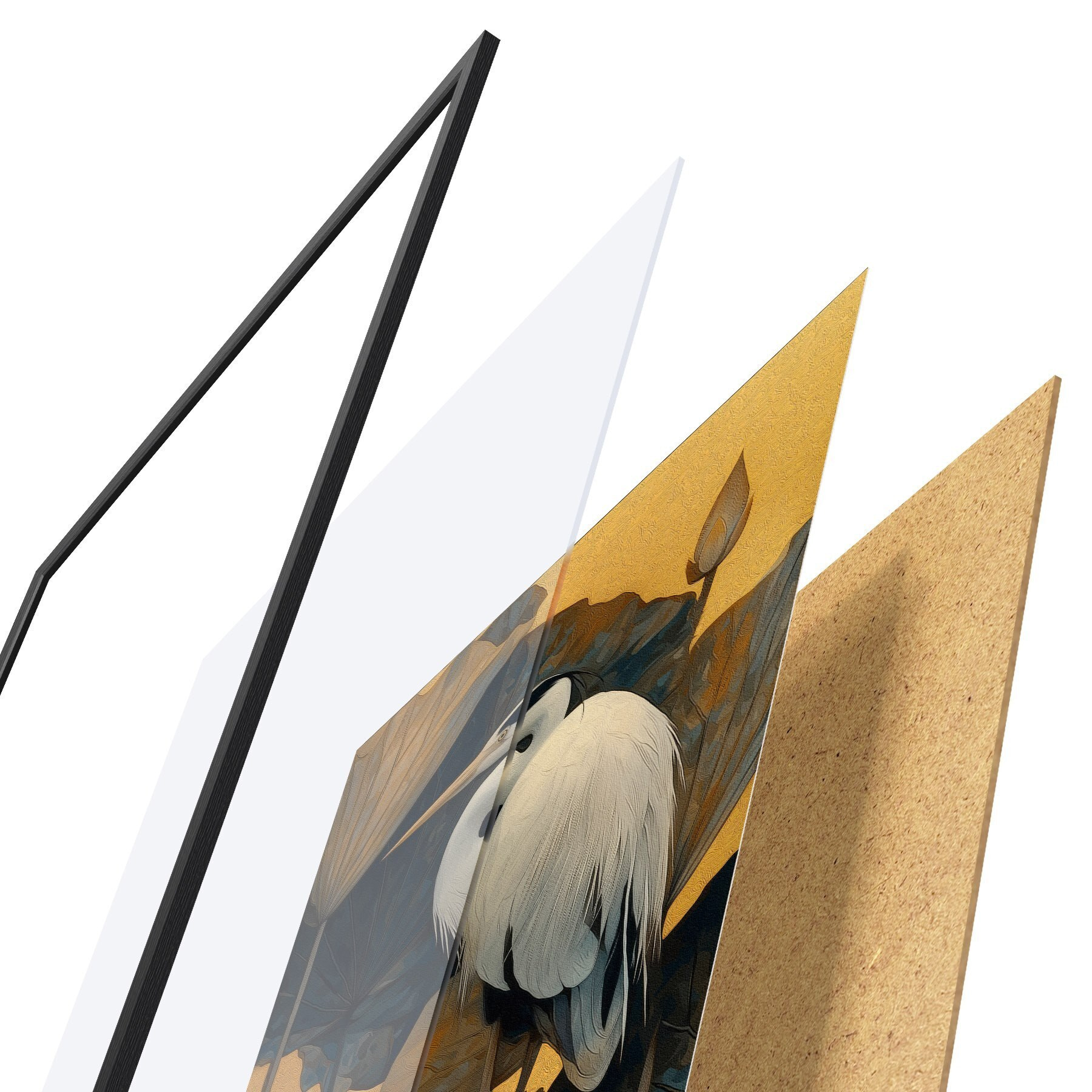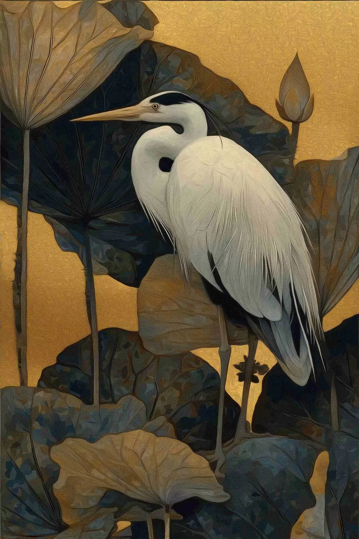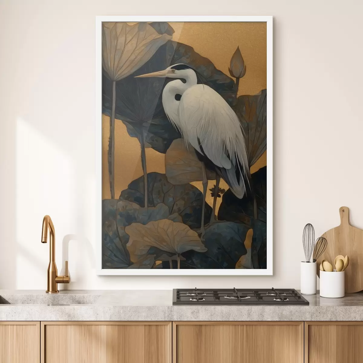 Poster Weißer Reiher zwischen großen Blättern auf warmem Hintergrund Nr f46147