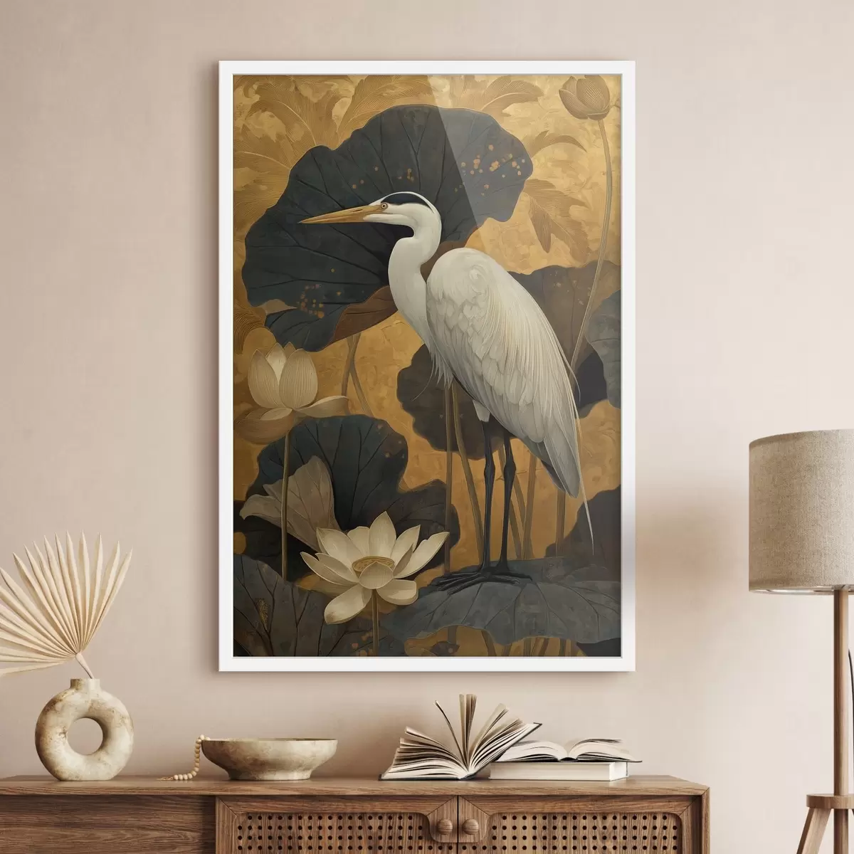 Poster Reiher zwischen Lotusblumen auf warmem Hintergrund f46148
